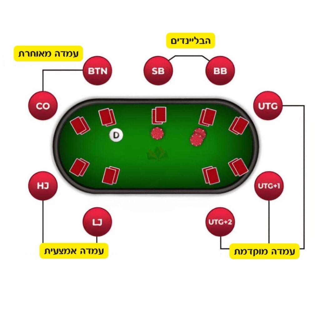 | 4 | אנדר-דה-גאן +1 | UTG+1 | היג'ק / עמדה אמצעית | HJ / MP |