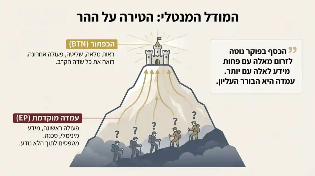 לעומת זאת, השחקנים בעמדה מוקדמת נמצאים בתחתית ההר. הם נאלצים לפעול ראשונים, למעשה מטפסים במעלה ההר לתוך ערפל קרב. אין להם מושג אם השחקנים מאחוריהם מכינים מארב עם ידיים חזקות או מתכוננים לקפל. כל החלטה היא ניחוש שנעשה עם מידע מינימלי. כפי שניתוח אחד מציין, אם אתה בתחתית ההר, "איזה נשק יכול להיות לך שיגרום לך להיות בטוח בטיפוס דרך אויבים מרובים בדרך לטירה בפסגת ההר?". אנלוגיה זו מסכמת באופן מושלם את המציאות האסטרטגית: ככל שאתה פועל מאוחר יותר, כך העמדה שלך חזקה יותר. הכסף בפוקר נוטה לזרום מאלה עם פחות מידע לאלה עם יותר, ועמדה היא הבורר העליון של מי מקבל את המידע הזה.