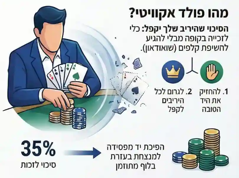 פולד אקוויטי הוא מושג יסוד בפוקר שנותן לך דרך נוספת לזכות ביד. במילים פשוטות, פולד אקוויטי הוא הסיכוי שהיריב שלך יקפל (יפרוש) להימור או רייז שלך. כאשר היריב מקפל, אתה זוכה בקופה מבלי שתצטרך להראות את היד הטובה ביותר. במילים אחרות, פולד אקוויטי אומר שיש לך שתי דרכים לזכות בקופה – או על ידי החזקת היד הטובה ביותר בשואודאון או על ידי גרימת היריב לקפל לפני השואודאון. מדריך זה יסביר את פולד אקוויטי במונחים ידידותיים, מדוע הוא חשוב, כיצד להעריך אותו במהלך המשחק, וכיצד הוא שונה בין טורנירים למשחקי קאש. נעבור גם על דוגמאות, נכלול כמה טבלאות שימושיות על גודל בטים ופולד אקוויטי, נפריך תפיסות מוטעות נפוצות, ונציע טיפים לשימוש יעיל בפולד אקוויטי באסטרטגיה שלך.